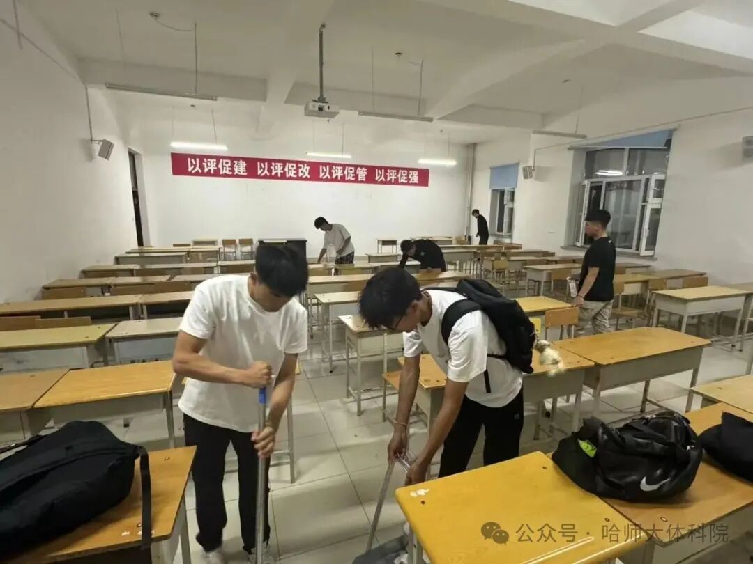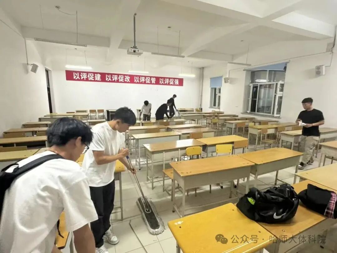 体育科学学院高度重视,由学院领导牵头,辅导员具体负责,通过年级大会、主题班会等形式进行动员,明确要求,责任到人。要求学院所属固定教室、公共自习室及各体育场馆的地面、桌面、黑板及板槽彻底清理,擦拭门窗、讲台,整理、归置讲台物品,清倒垃圾,确保卫生工具摆放整齐,检查并上报公共设施损坏情况。所有学生进行寝室内部大扫除,保持地面、桌面、床铺整洁,合理收纳个人物品,保持通风,无异味。